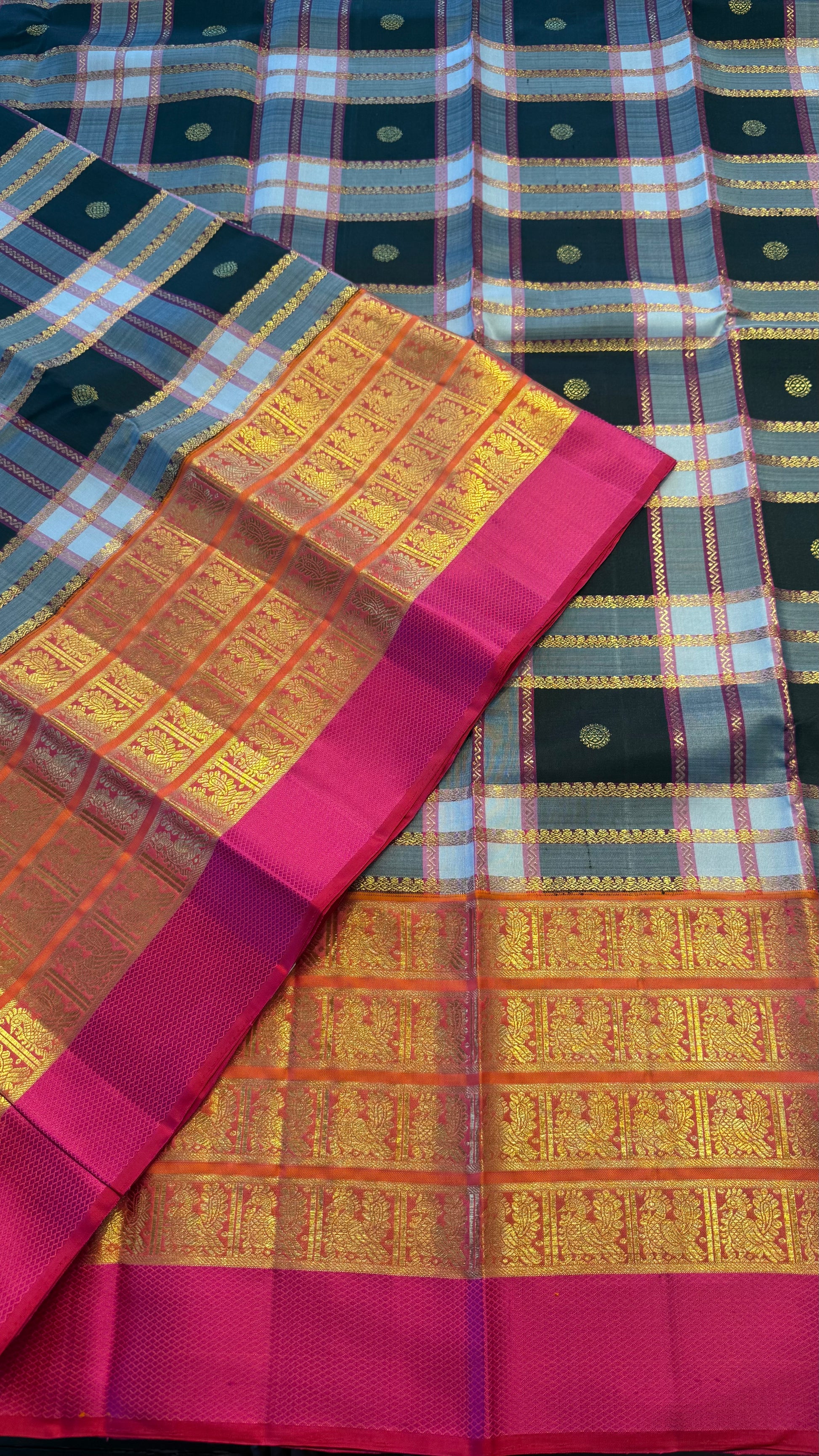 BLACK AND WHITE CHECKED WITH CONTRAST KANAKAMBARAM PINK GOLD ZARI HANDLOOM KANICHIPURAM SILK SAREE (KSS281)
