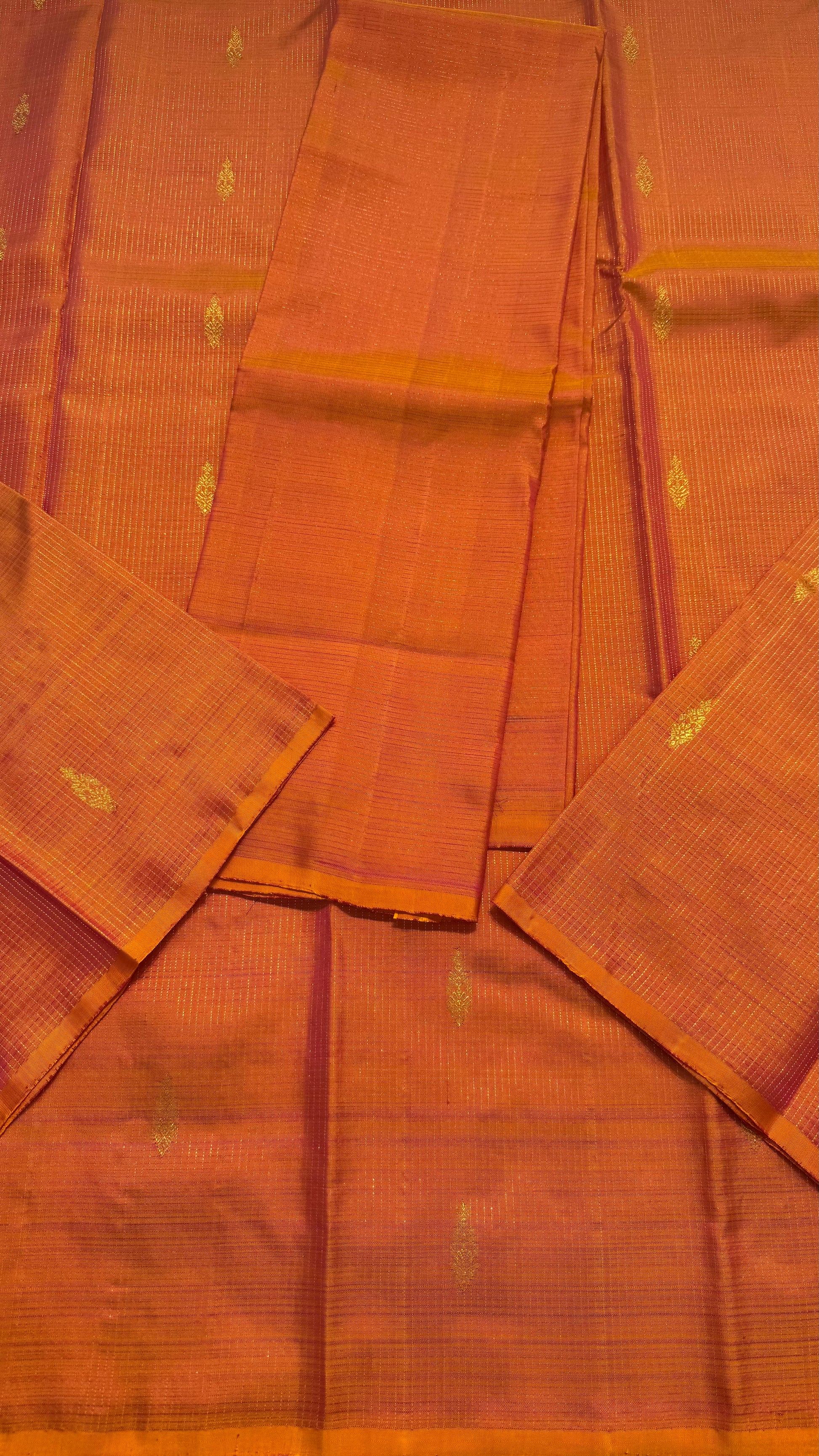 KANAKAMBARAM ORANGE PINK SMALL KATTAM BORDERLESS GOLD ZARI HANDLOOM KANICHIPURAM SILK SAREE (KSS79)