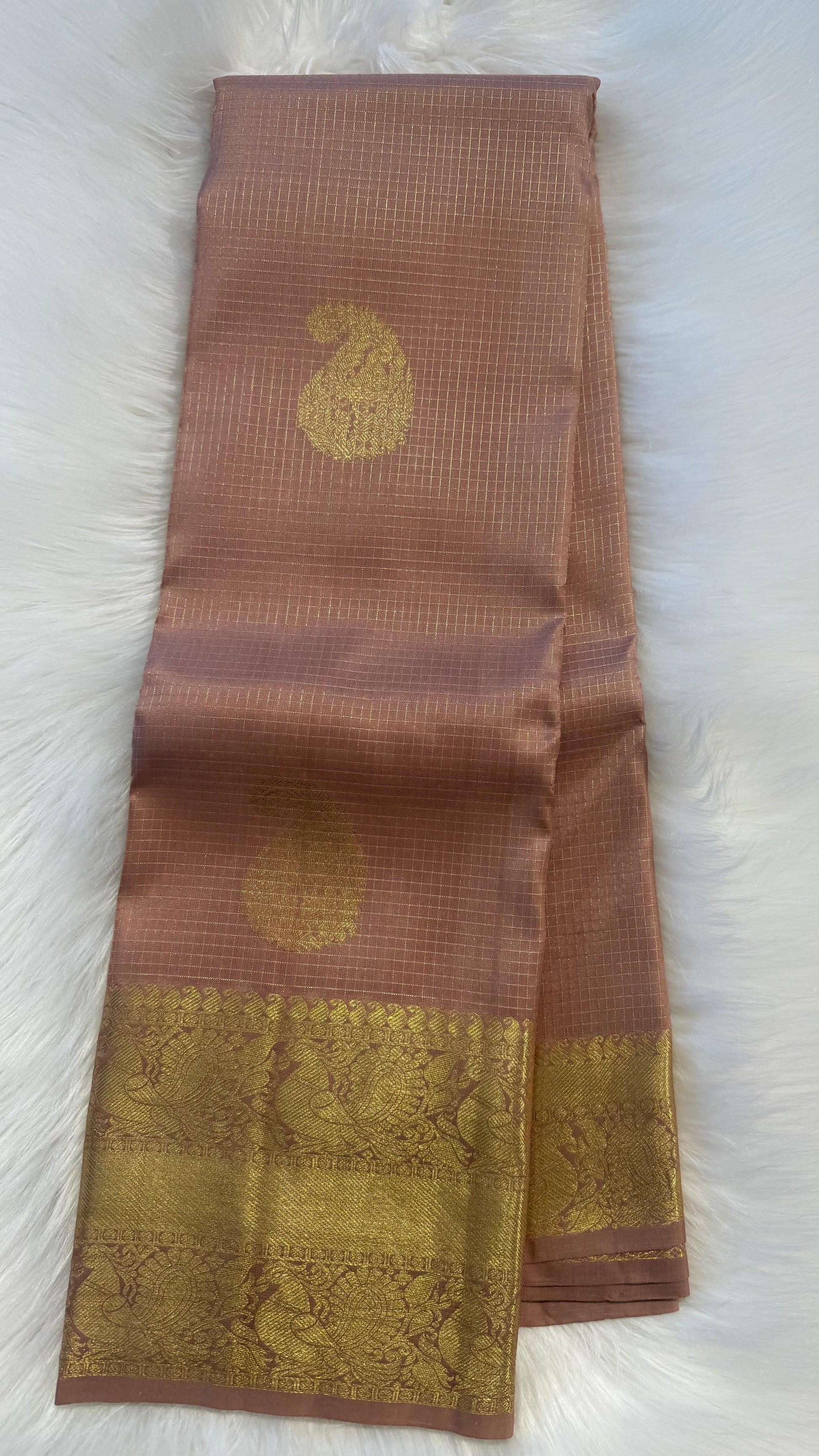 CHAMPAGNE CHECKED GOLD ZARI HANDLOOM KANCHIPURAM SILK SAREE (KSS409)