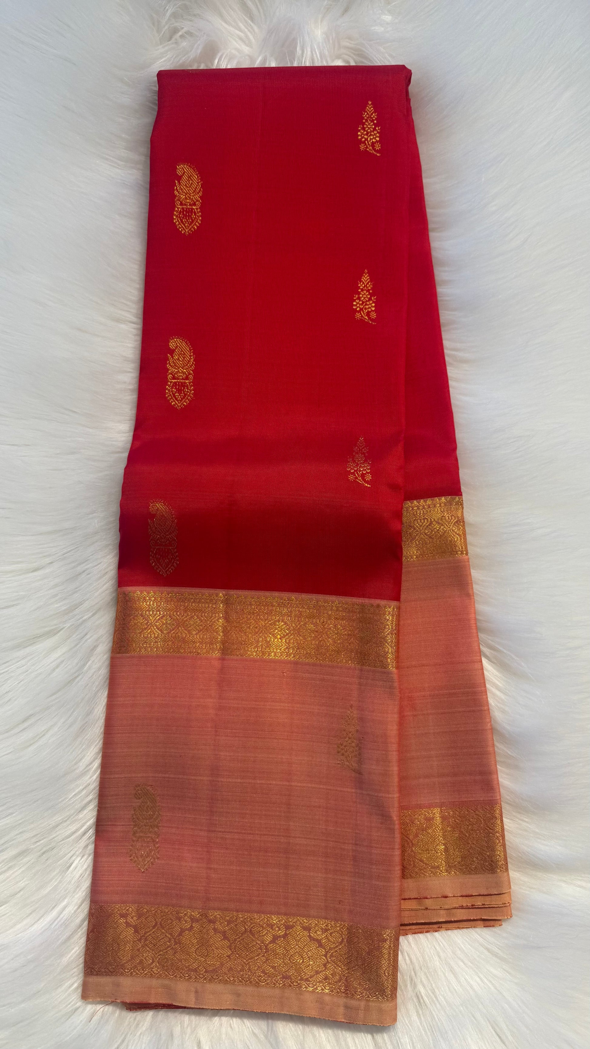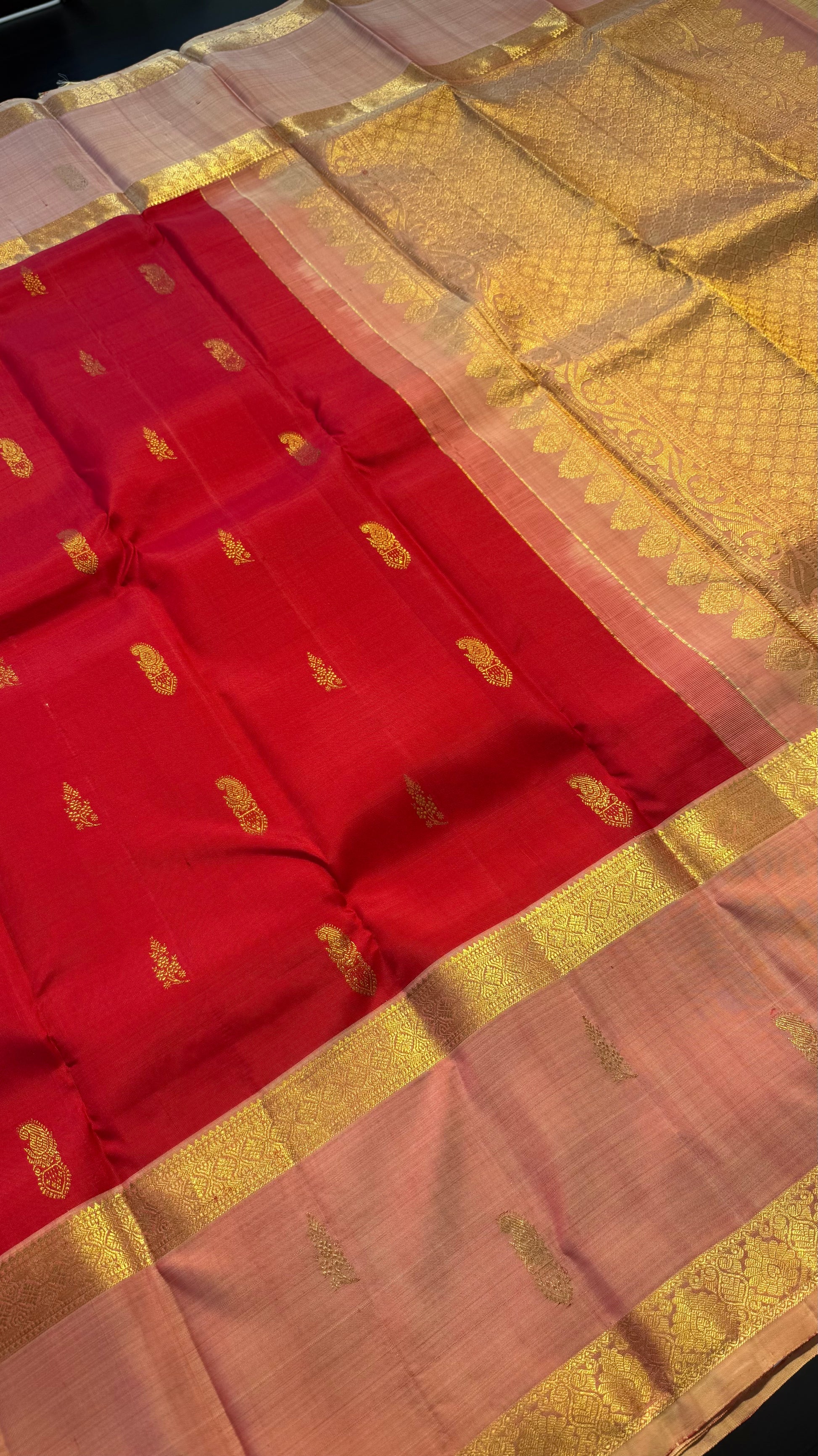 CHILI RED WITH CONTRAST PASTEL CORAL GOLD ZARI HANDLOOM KANCHIPURAM SILK SAREE (KSS417)