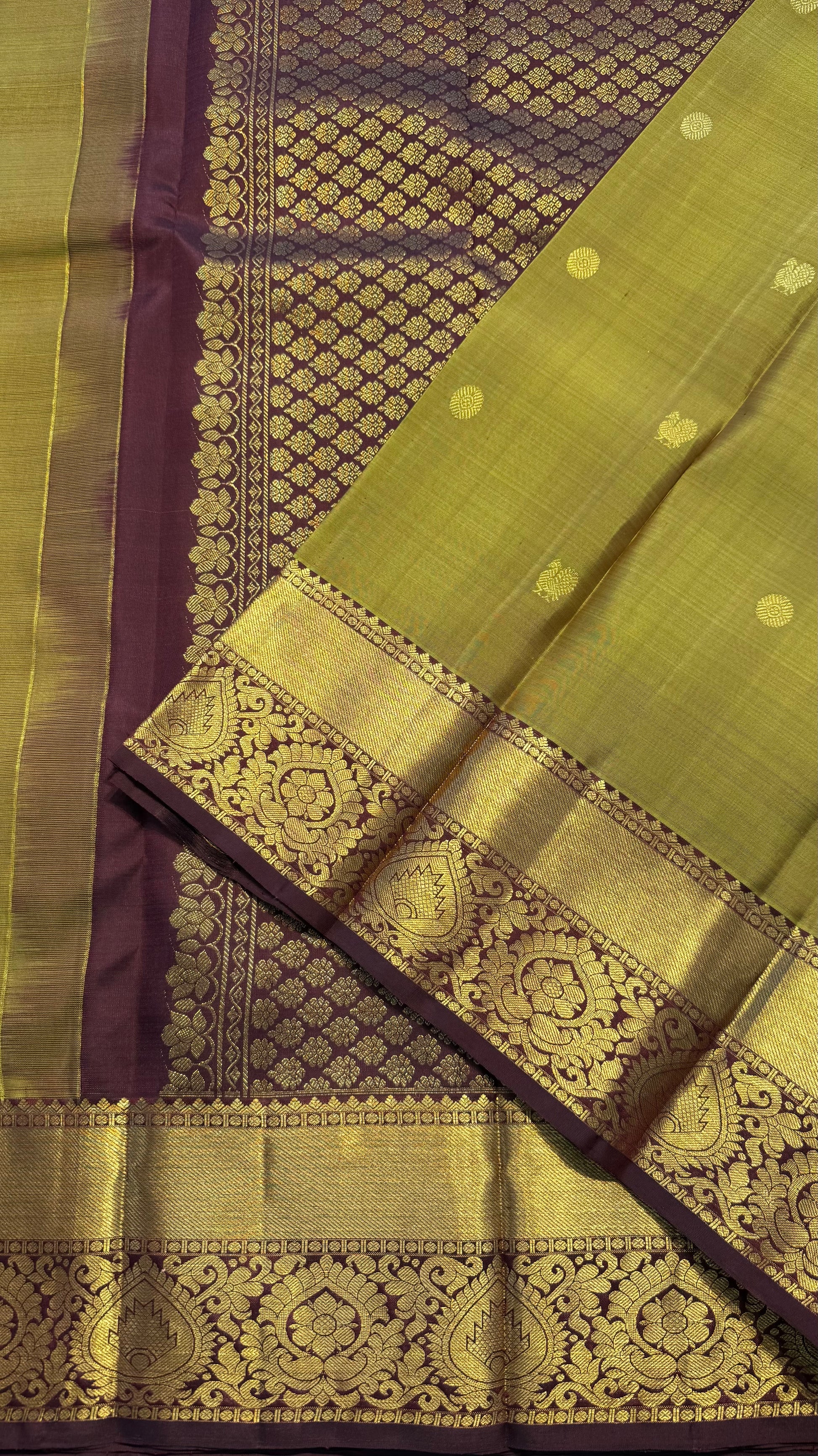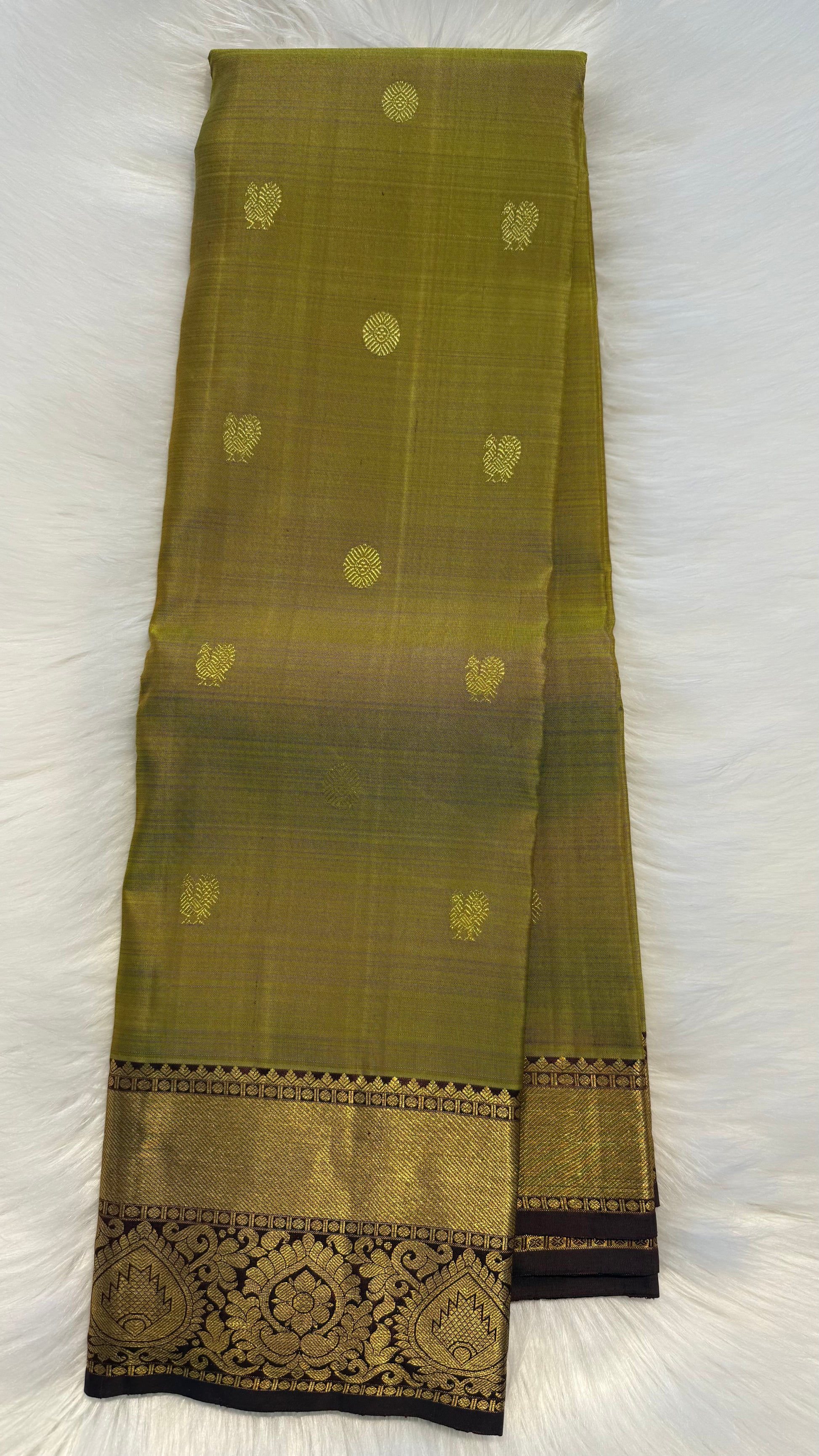 DUAL TONE OLIVE GREEN WITH CONTRAST DARK BROWN HANDLOOM KANCHIPURAM SILK SAREE (KSS424)