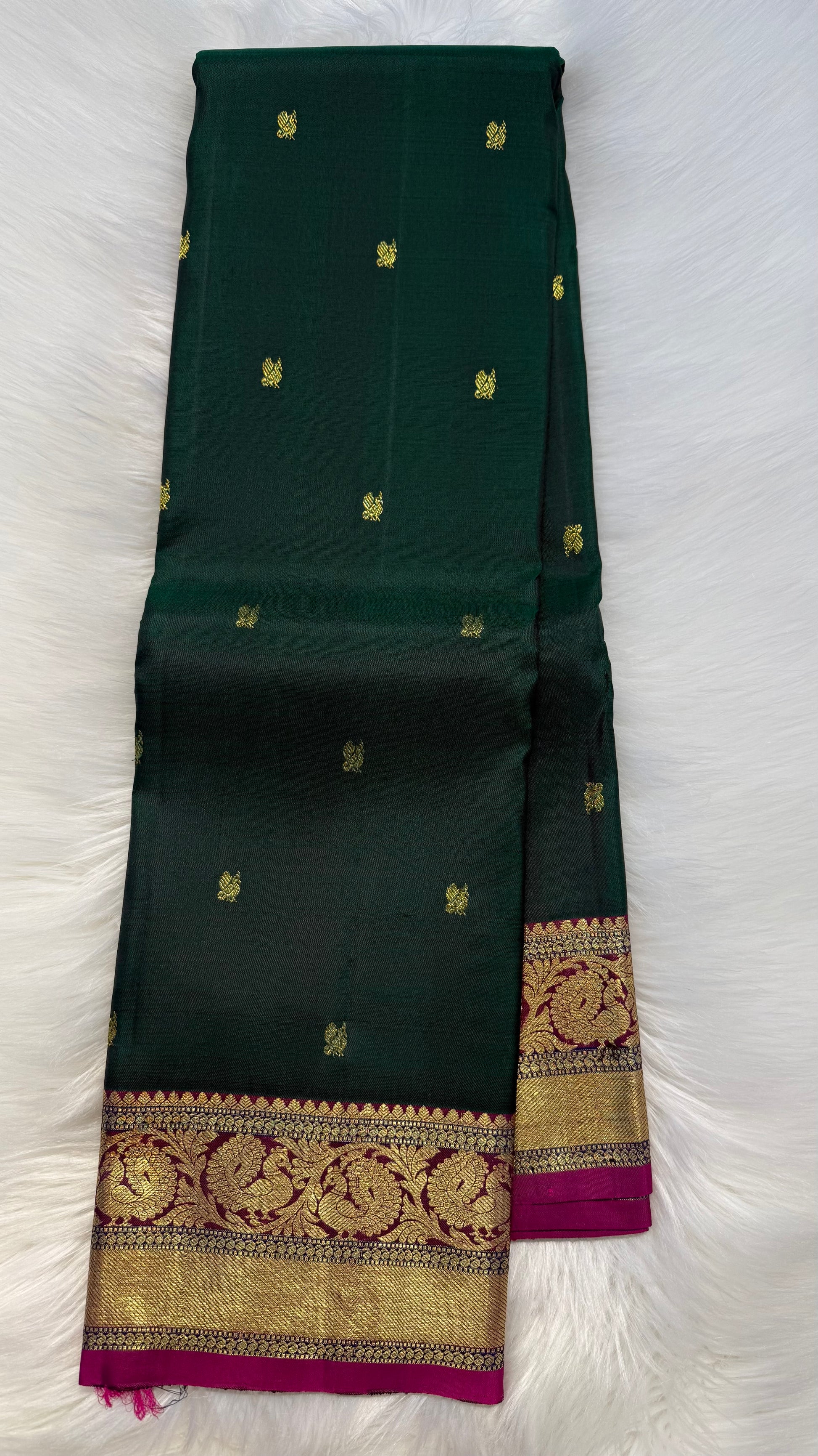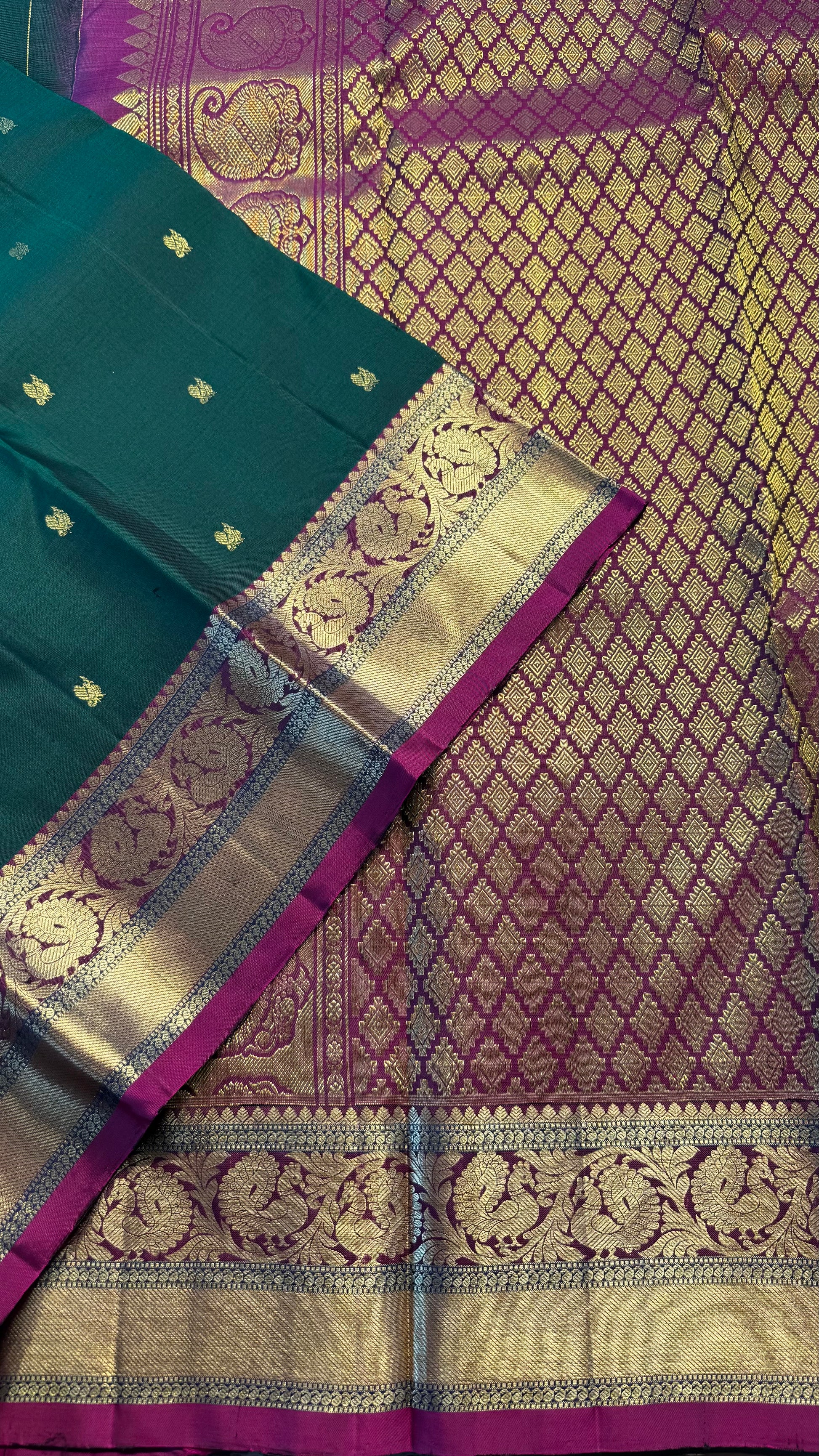 FOREST GREEN WITH CONTRATS PURPLE GOLD ZARI HANDLOOM KANCHIPURAM SILK SAREE (KSS361)