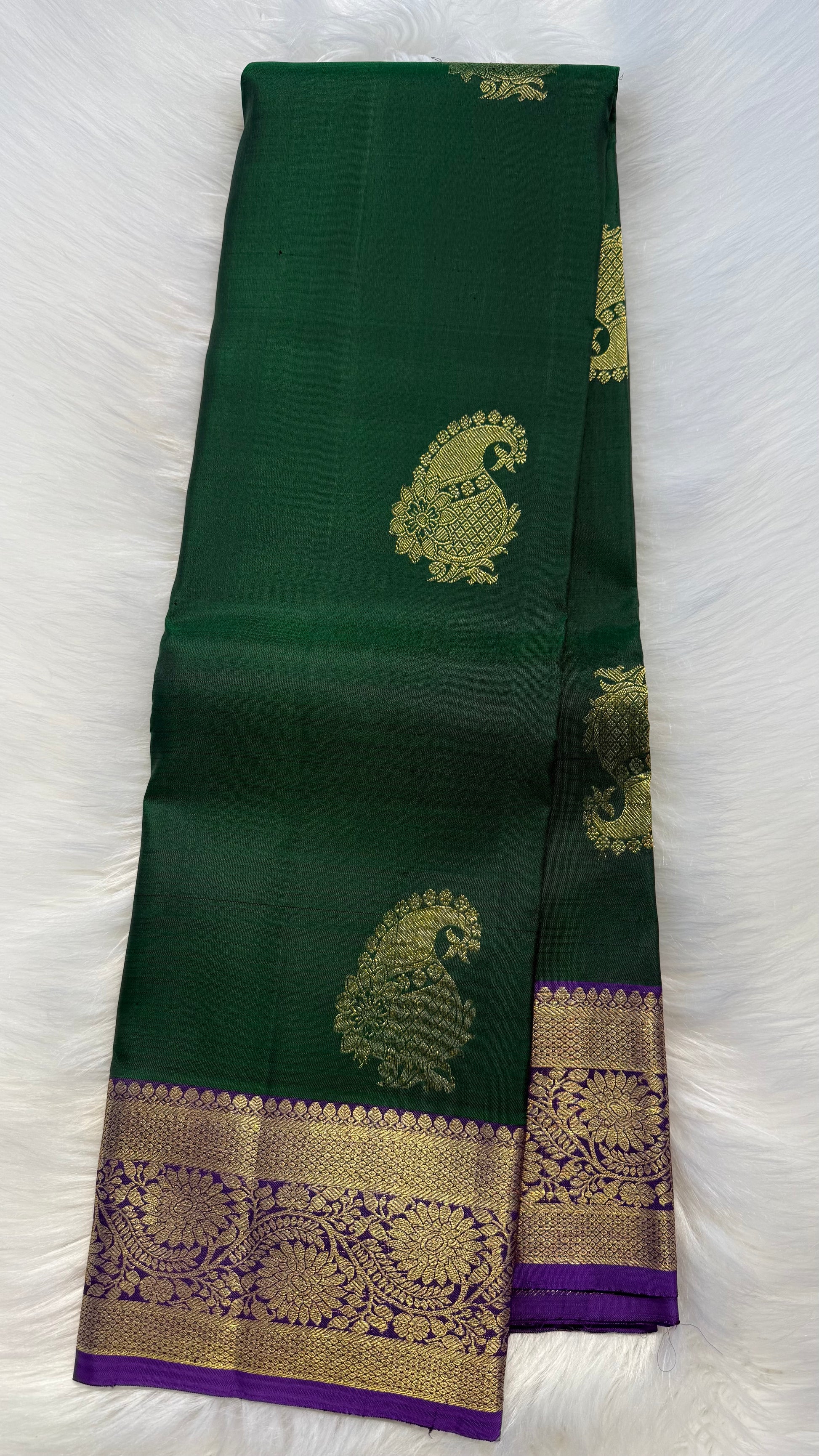 FOREST GREEN WITH CONTRATS PURPLE GOLD ZARI HANDLOOM KANCHIPURAM SILK SAREE (KSS403)