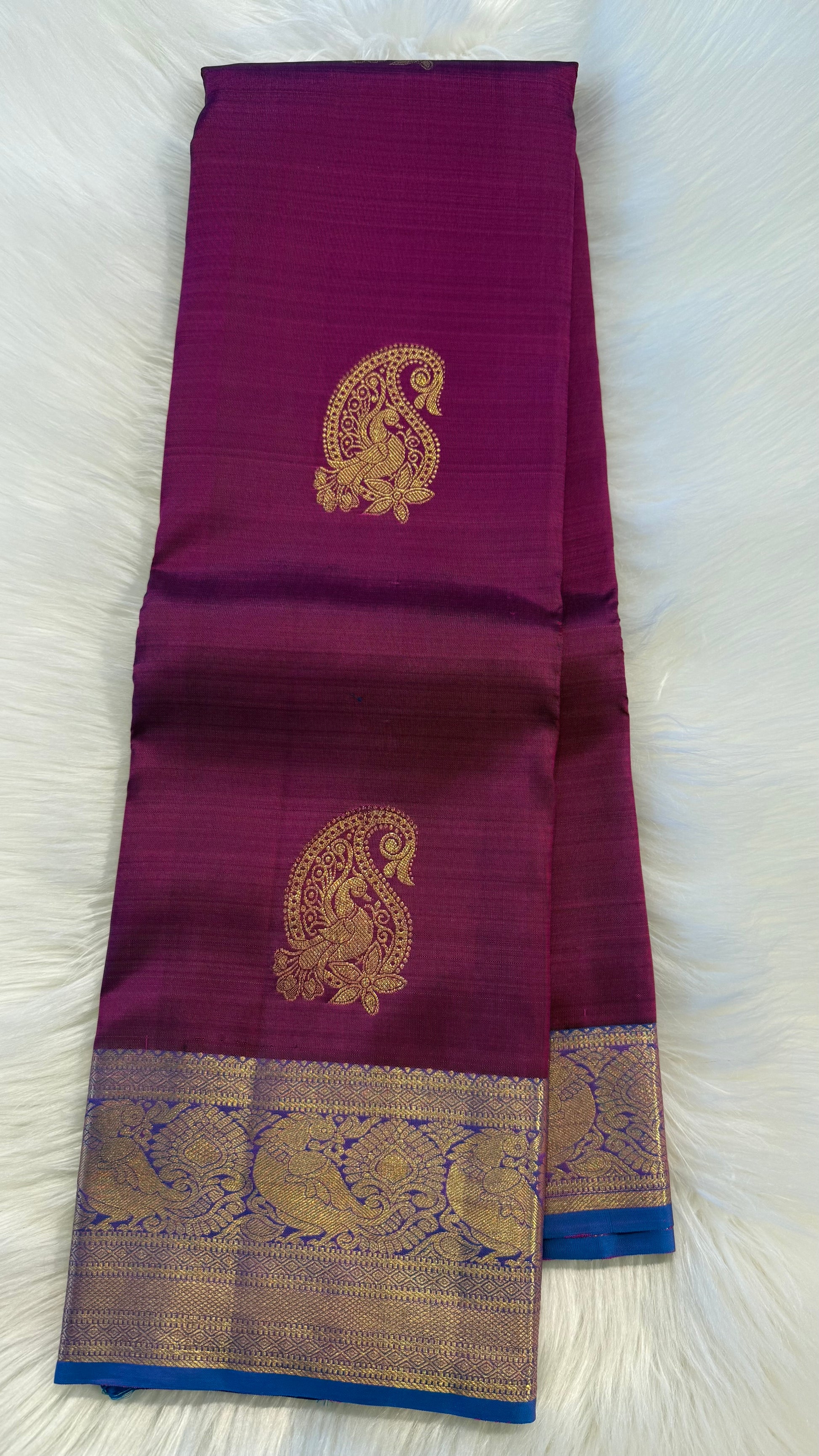 GRAPE PURPLE WITH CONTRAST DUAL TONE BLUE GOLD ZARI HANDLOOM KANCHIPURAM SILK SAREE (KSS340)