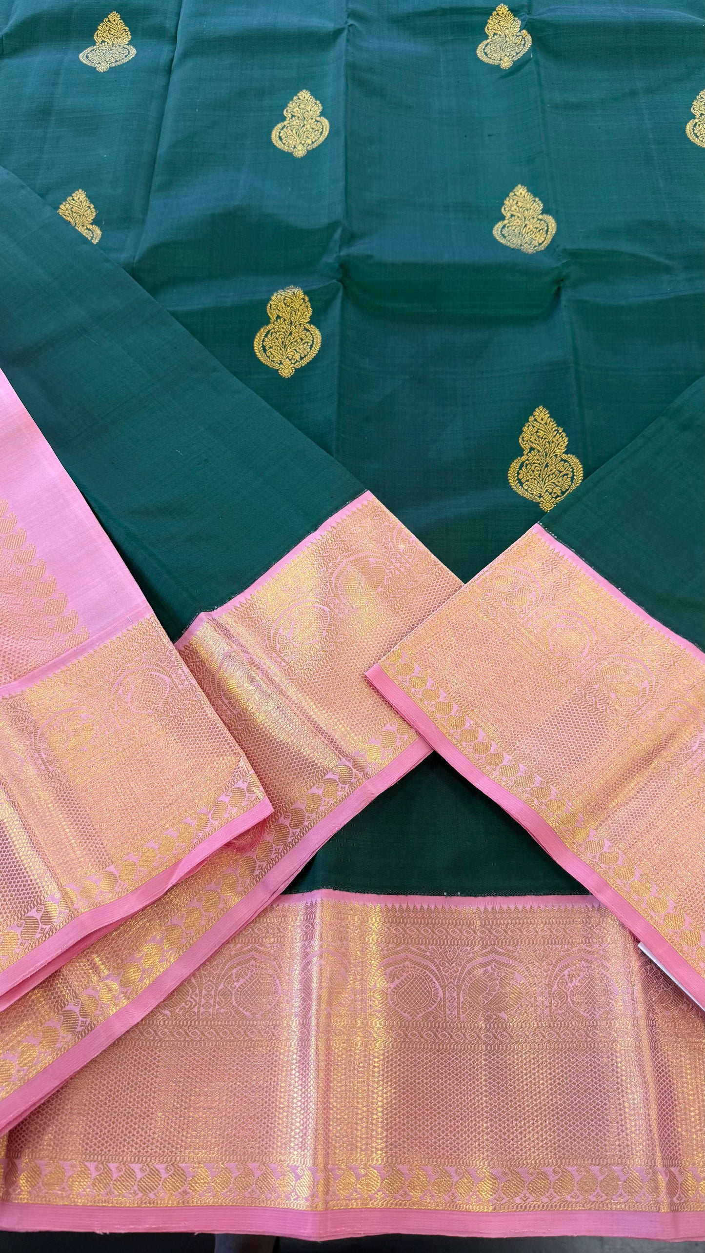GREEN WITH CONTRAST PINK GOLD ZARI HANDLOOM KANICHIPURAM SILK SAREE (KSS164)