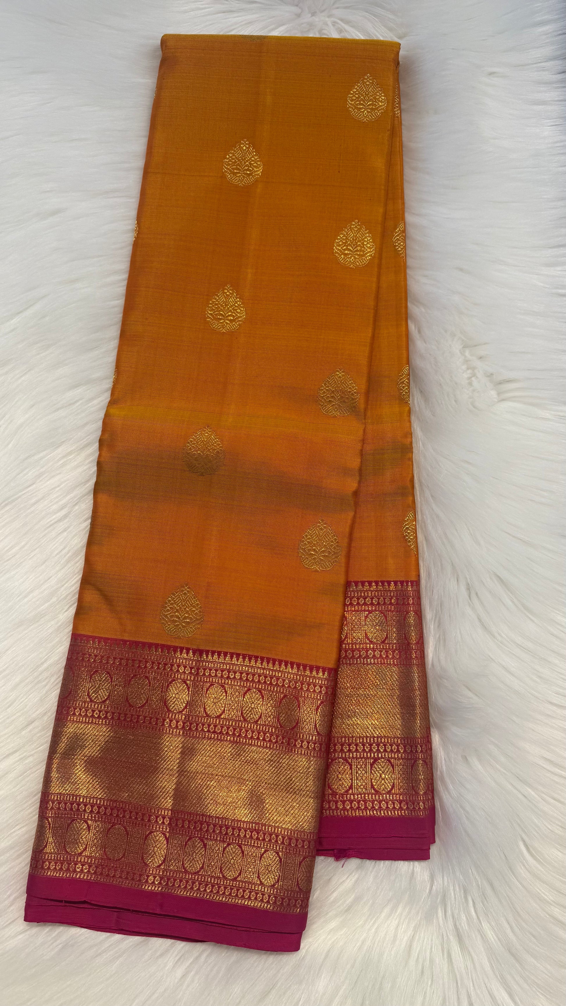 MANGO YELLOW WITH CONTRAST PINK GOLD ZARI HANDLOOM KANCHIPURAM SILK SAREE (KSS108)