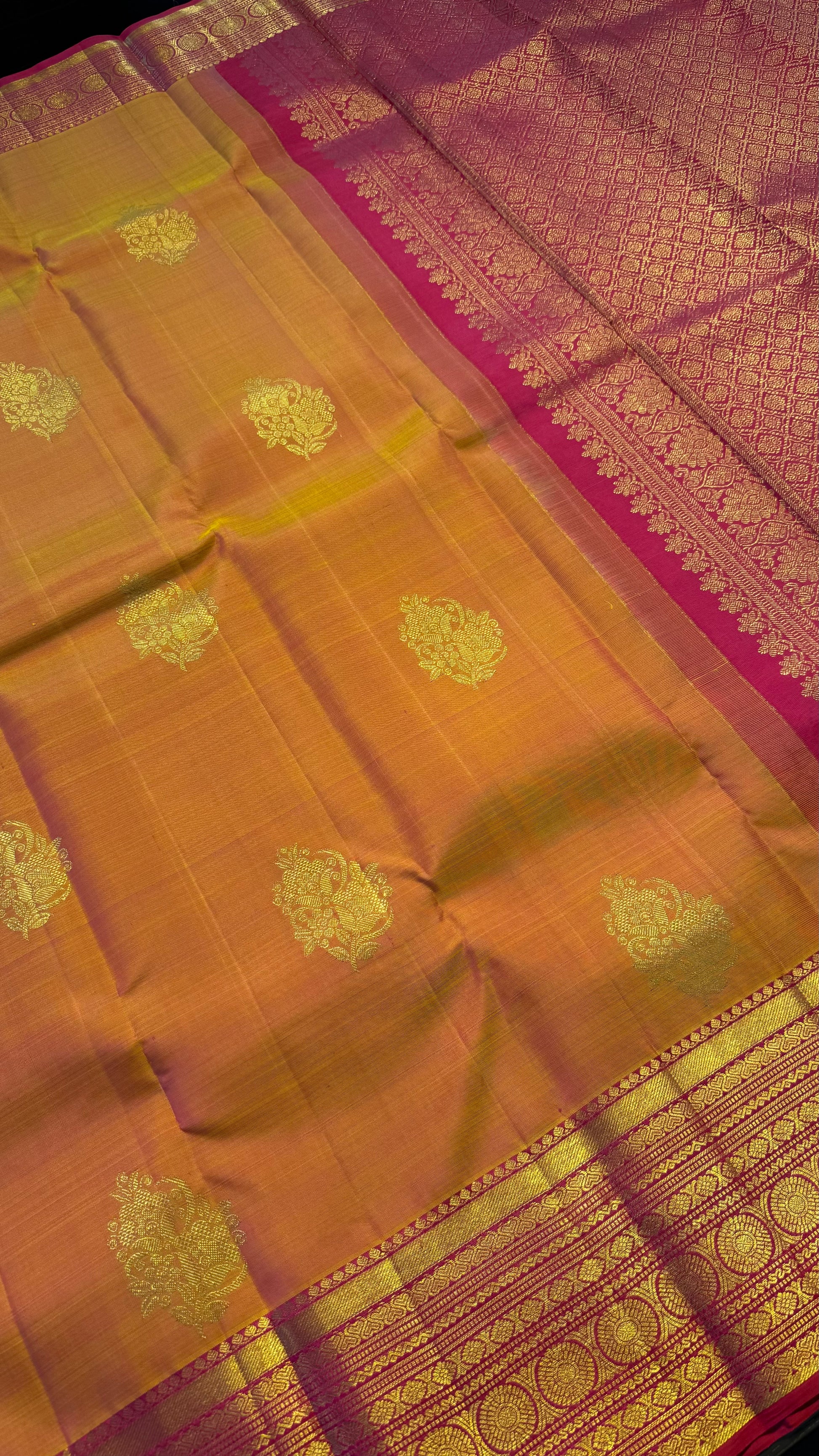 MANGO YELLOW WITH CONTRAST PINK GOLD ZARI HANDLOOM KANCHIPURAM SILK SAREE (KSS388)