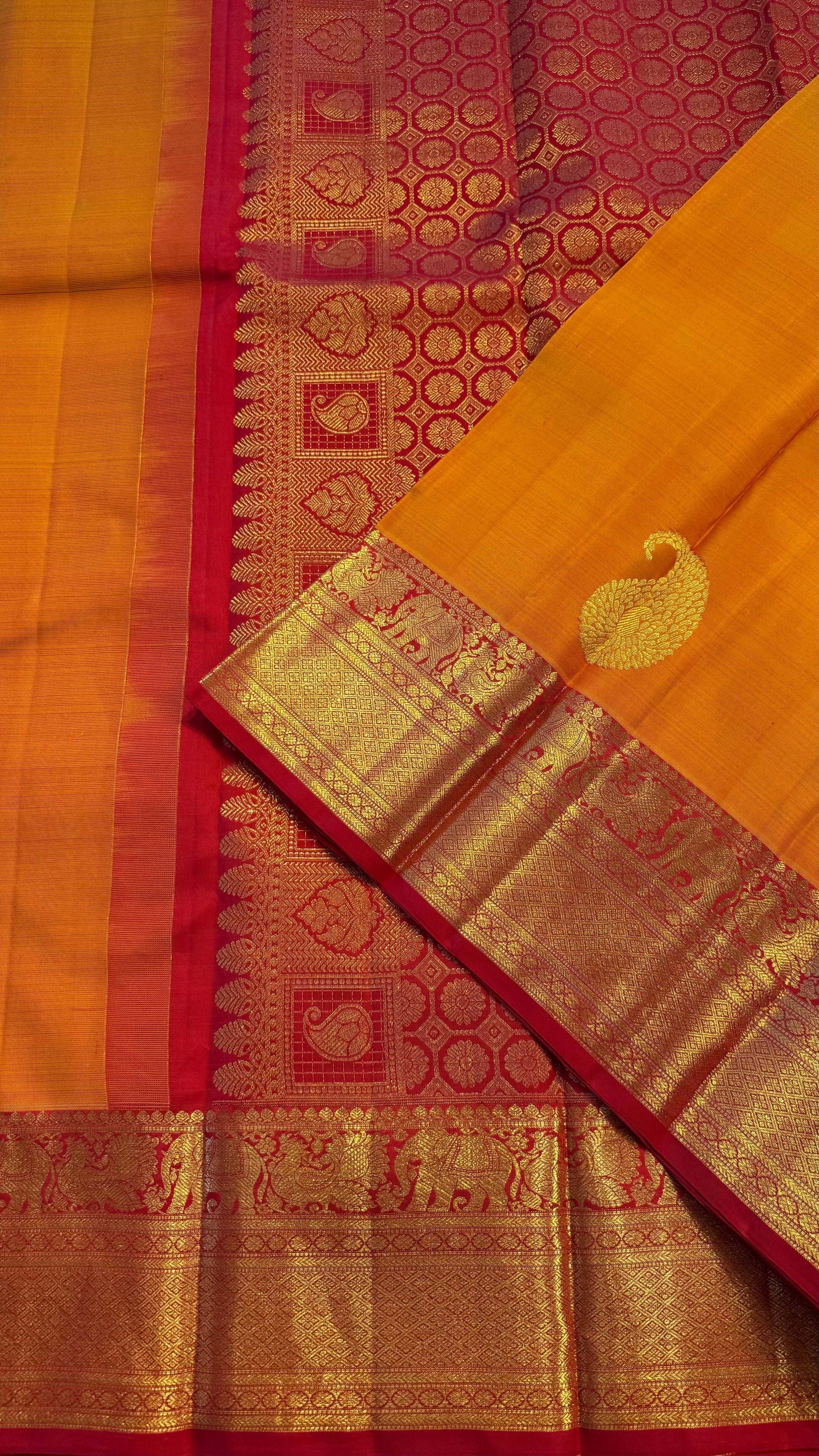 MANGO YELLOW WITH CONTRAST RED GOLD ZARI HANDLOOM KANCHIPURAM SILK SAREE (KSS406)