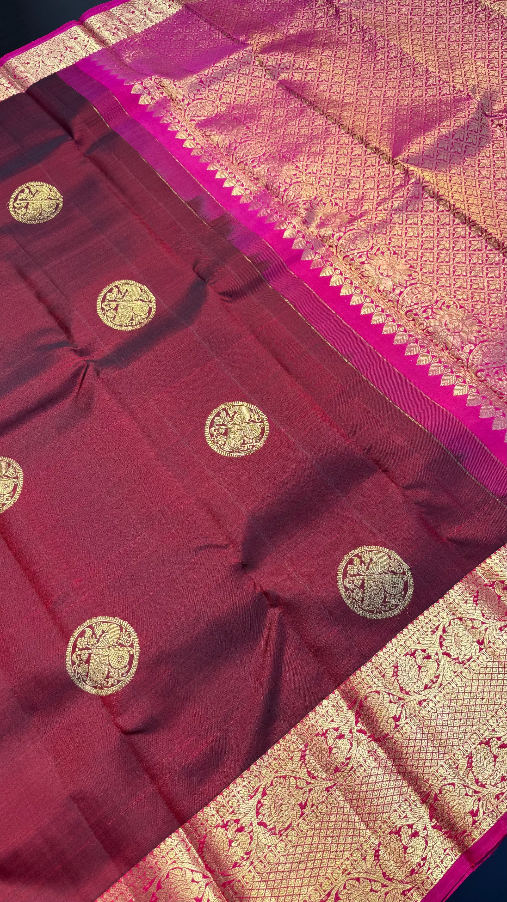 MAROON WITH CONTRAST PINK GOLD ZARI HANDLOOM KANICHIPURAM SILK SAREE (KSS376)