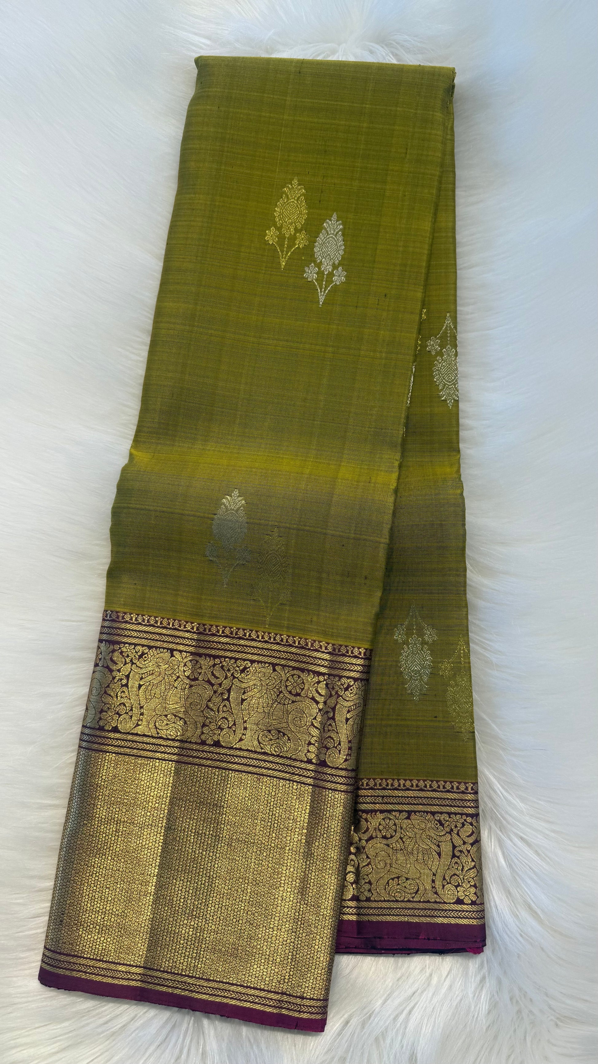 OLIVE GREEN WITH CONTRAST PURPLE GOLD ZARI HANDLOOM KANCHIPURAM SILK SAREE (KSS411)