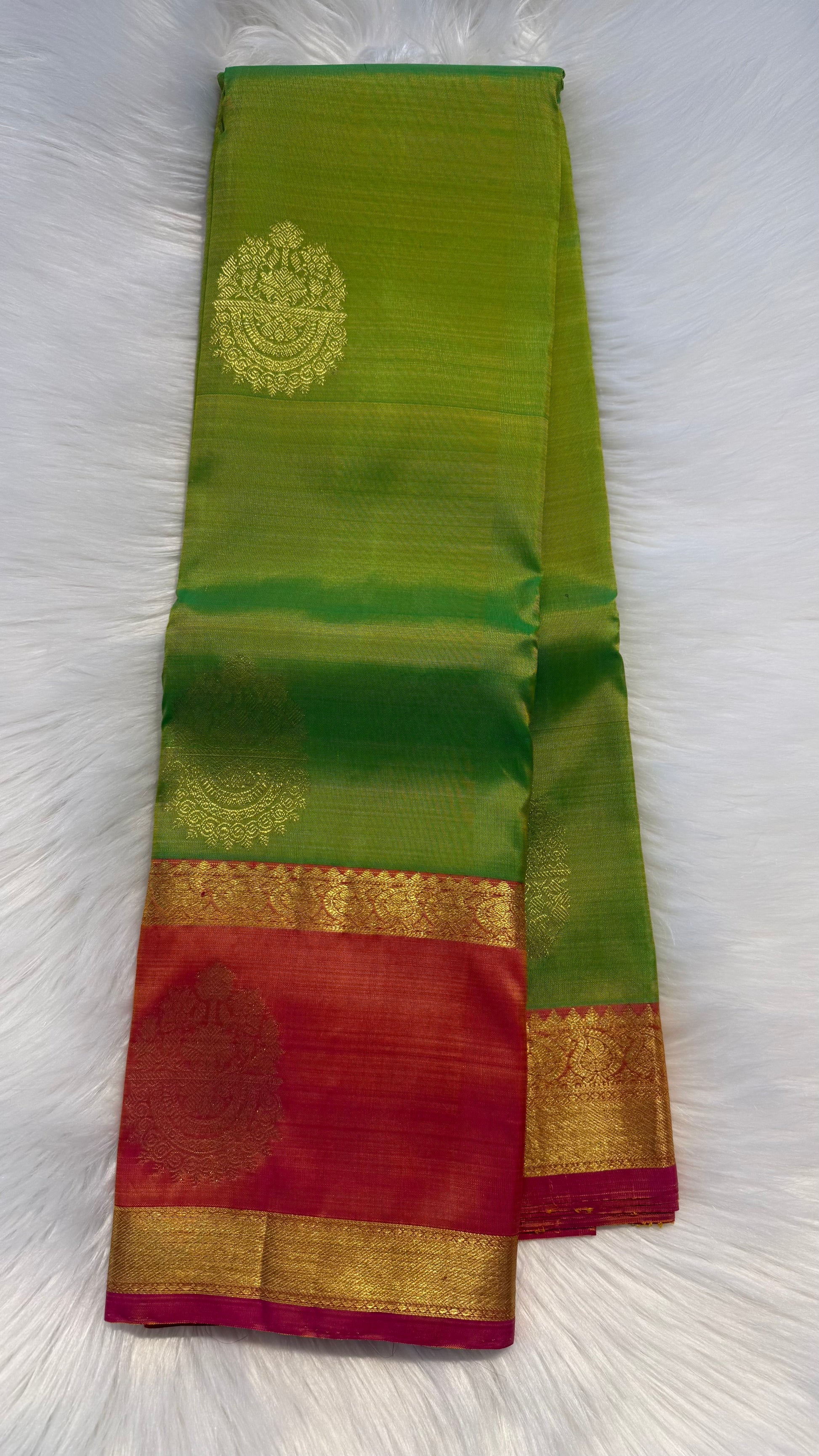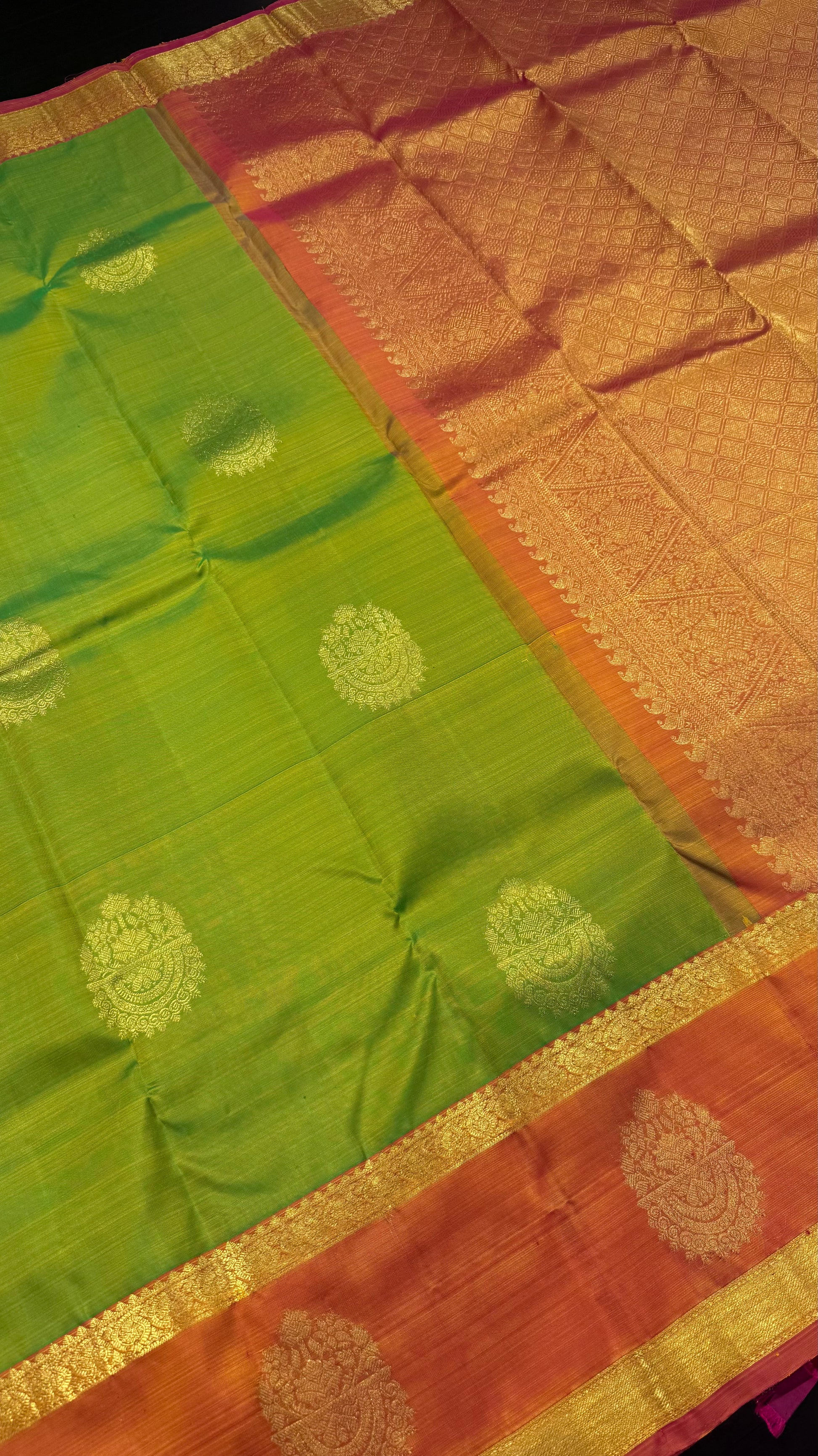 PARROT GREEN WITH DUAL TONE ORANGE CONTRAST HANDLOOM KANCHIPURAM SILK SAREE (KSS353)