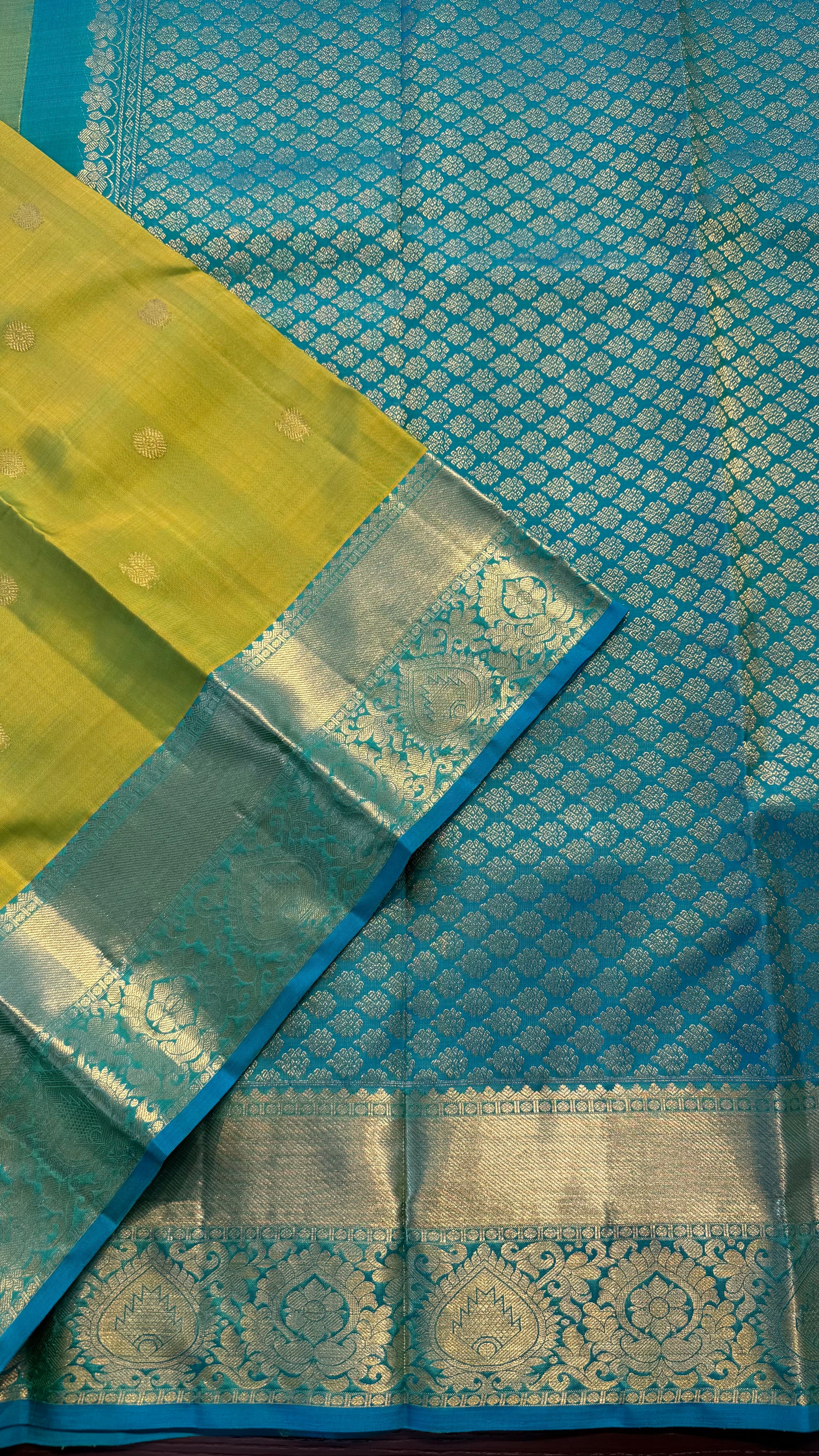 PARROT GREEN WITH TURQUOISE BLUE CONTRAST HANDLOOM KANCHIPURAM SILK SAREE (KSS405)