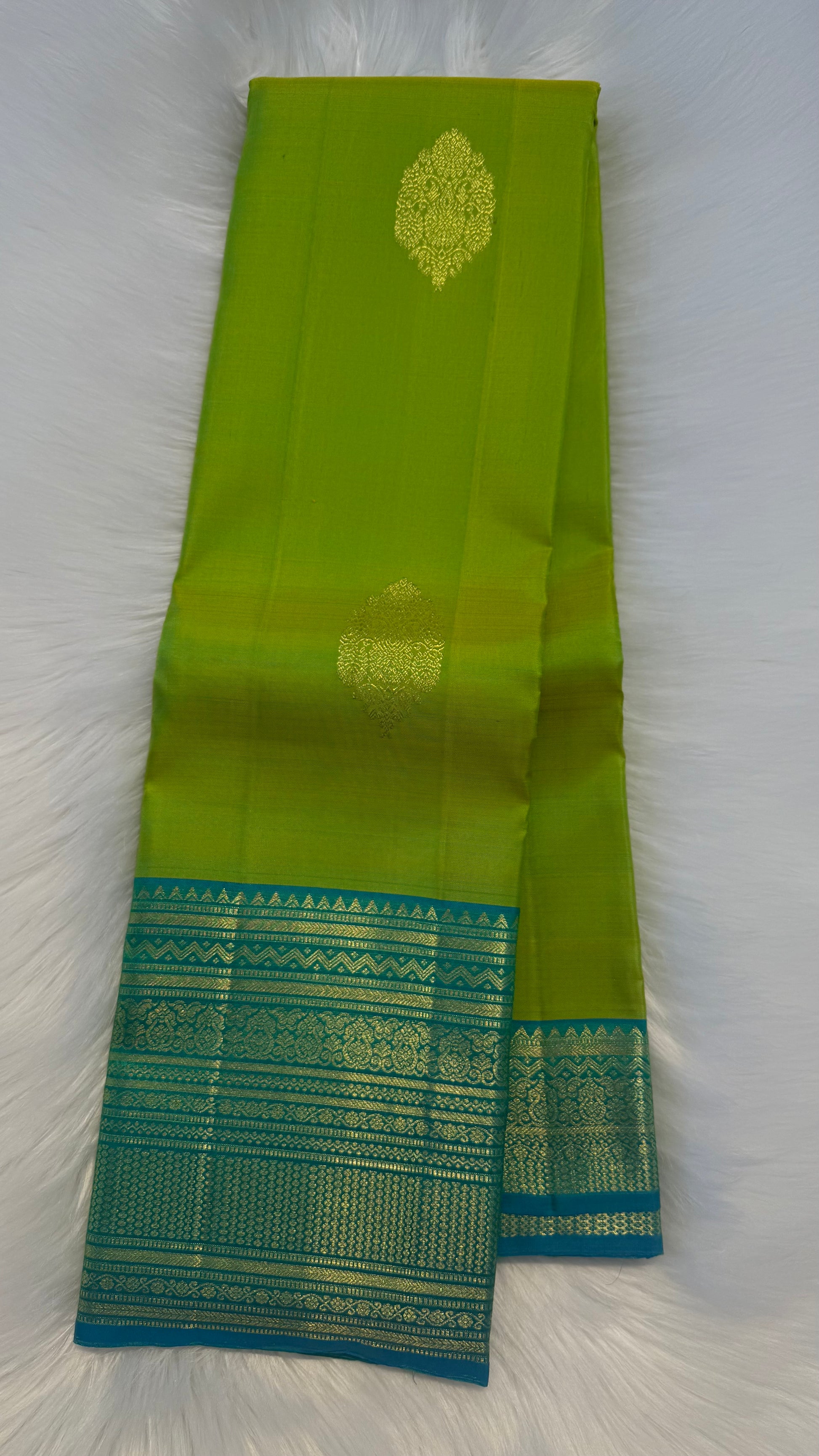 PARROT GREEN WITH TURQUOISE BLUE CONTRAST HANDLOOM KANICHIPURAM SILK SAREE (KSS433)