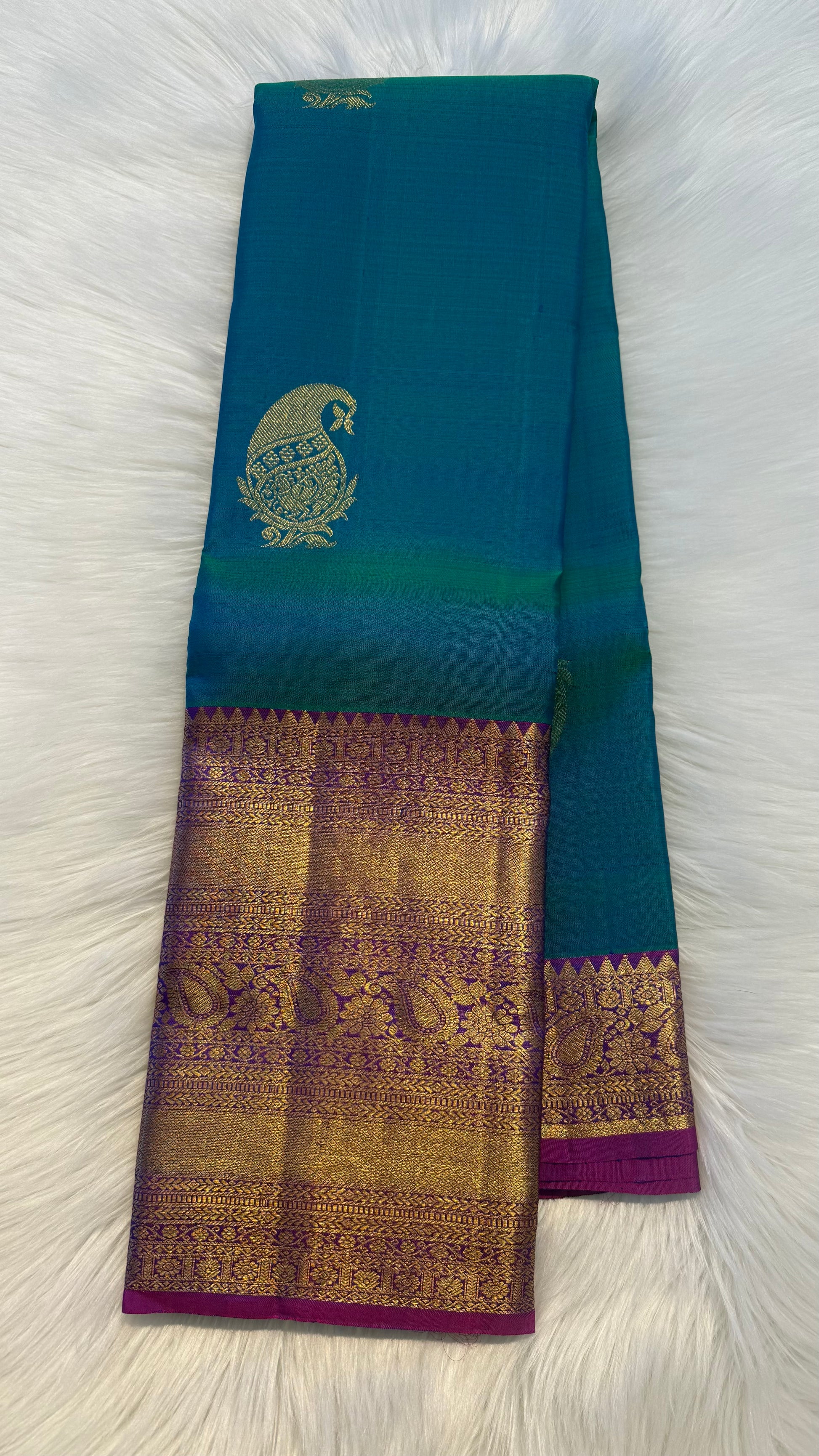 PEACOCK BLUE CONTRAST PURPLE GOLD ZARI HANDLOOM KANICHIPURAM SILK SAREE (KSS415)