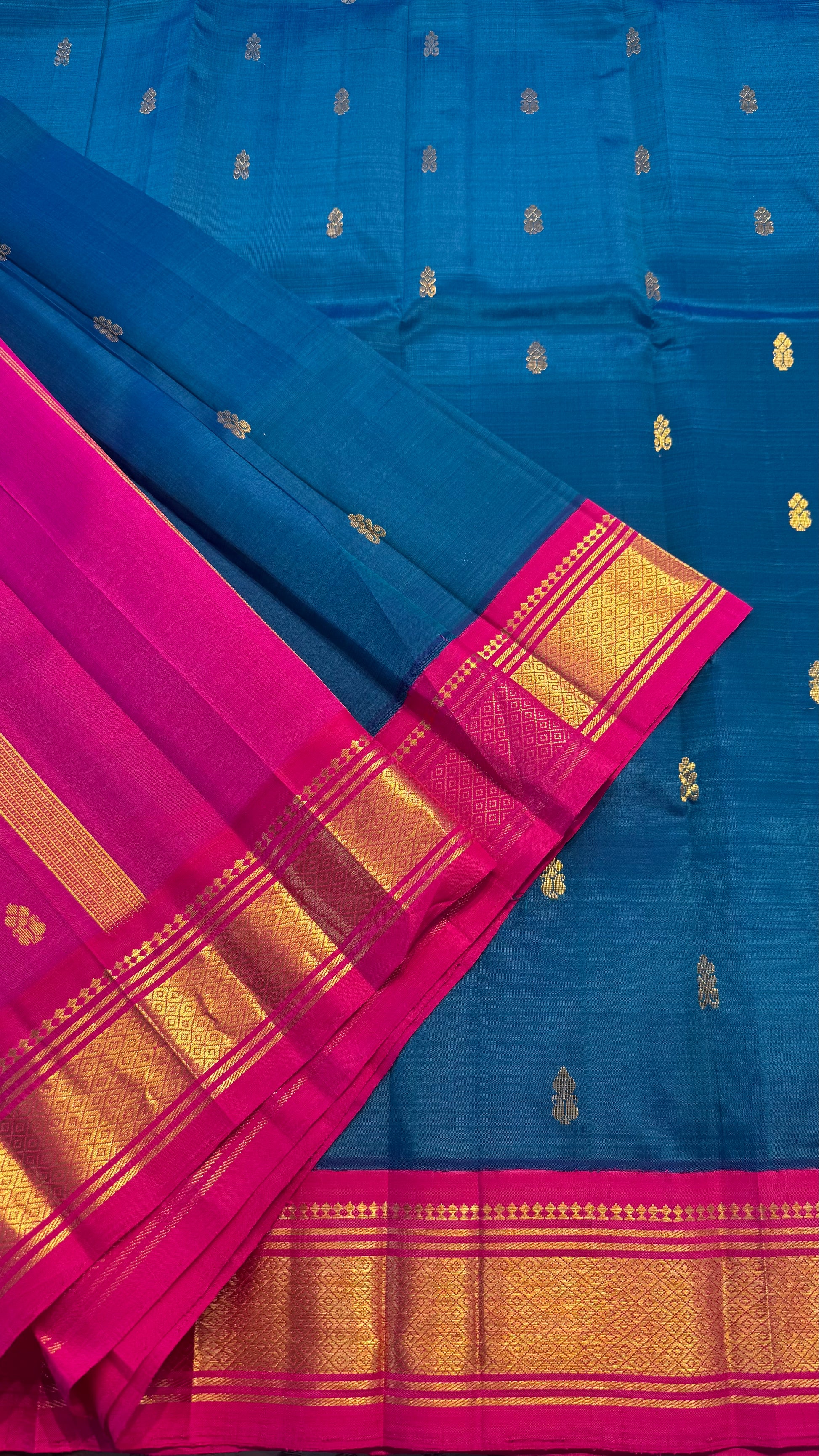 PEACOCK BLUE WITH CONTRAST HOT PINK PURE HANDLOOM KANCHIPURAM SINGLE SIDE BORDER SILK SAREE (KSSB11)