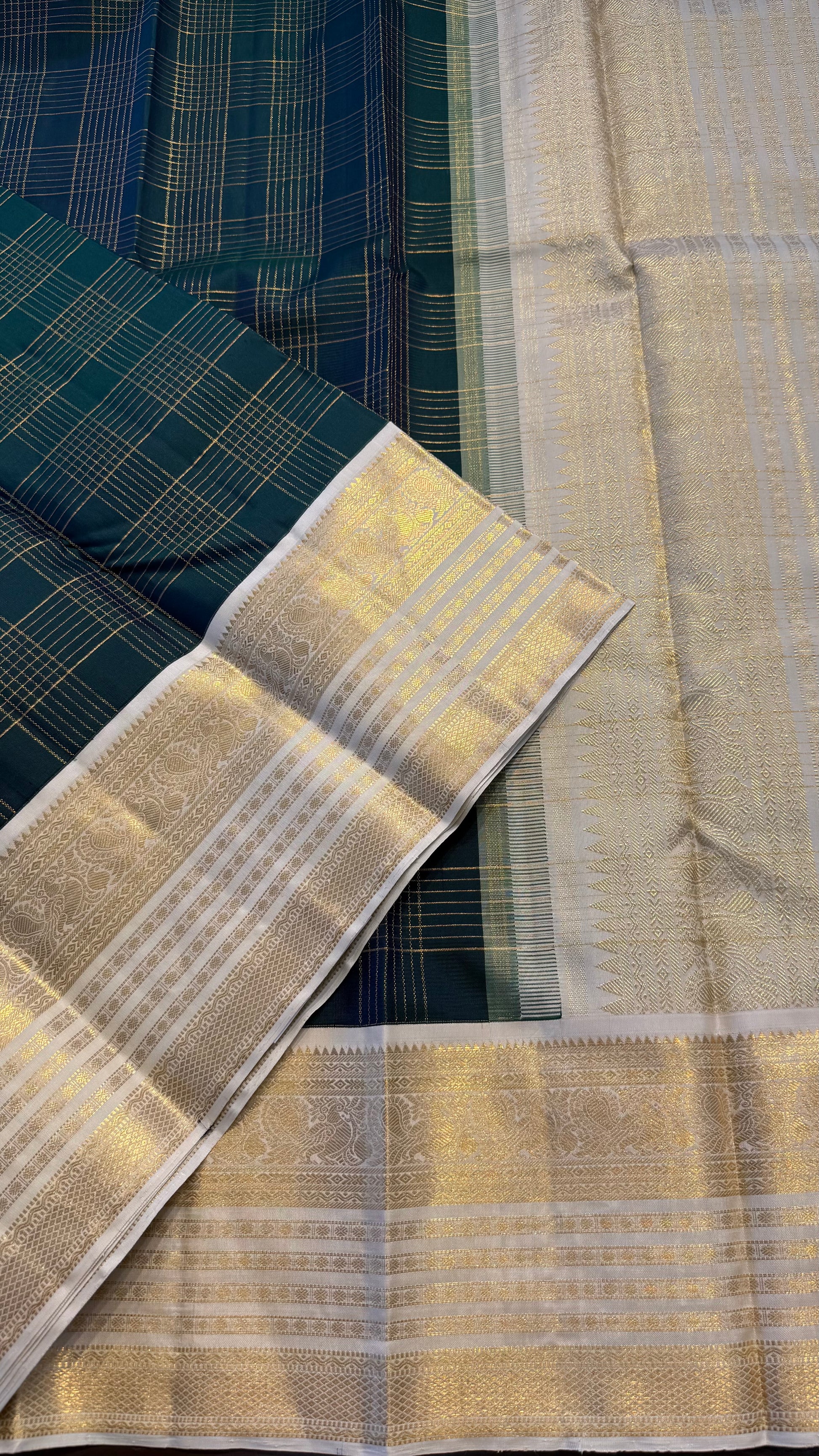 PEACOCK GREEN CHECKED WITH CONTRAST WHITE GOLD ZARI HANDLOOM KANCHIPURAM SILK SAREE (KSS458)