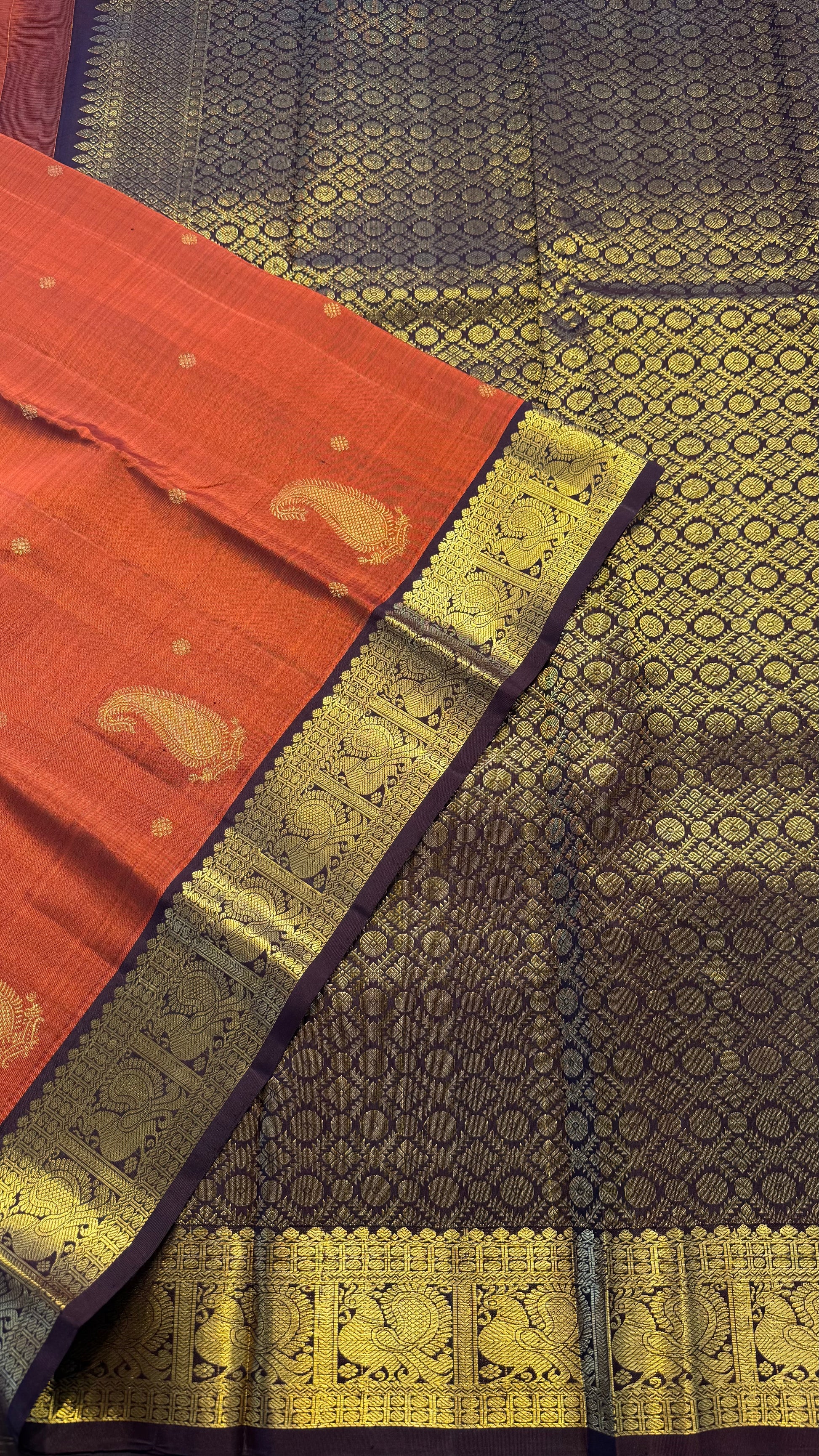 RUST ORANGE WITH CONTRAST DEEP BROWN GOLD ZARI HANDLOOM KANICHIPURAM SILK SAREE (KSS196)