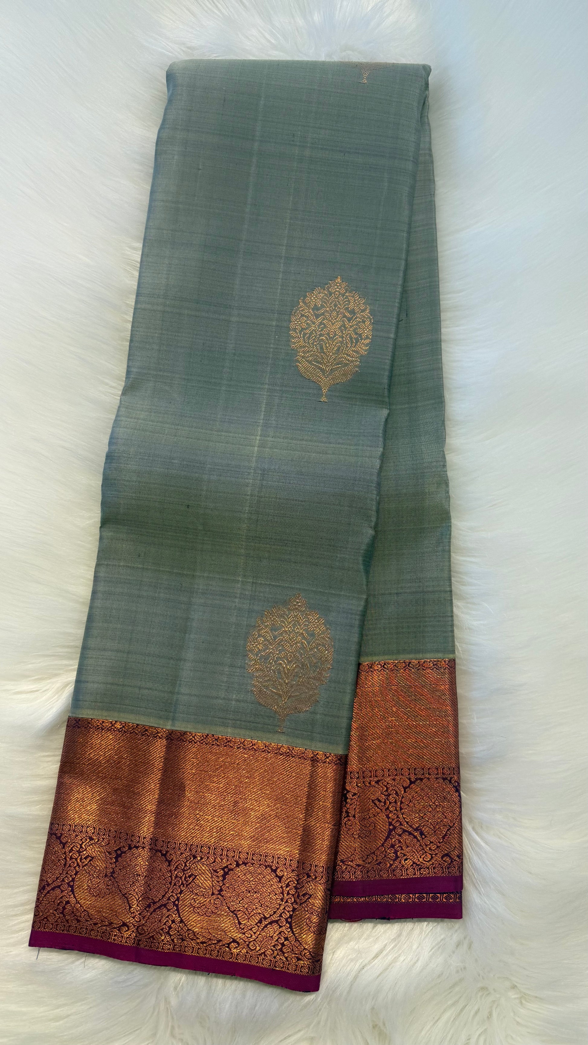 TAUPE GREY WITH CONTRAST PURPLE GOLD ZARI HANDLOOM KANICHIPURAM SILK SAREE (KSS329)