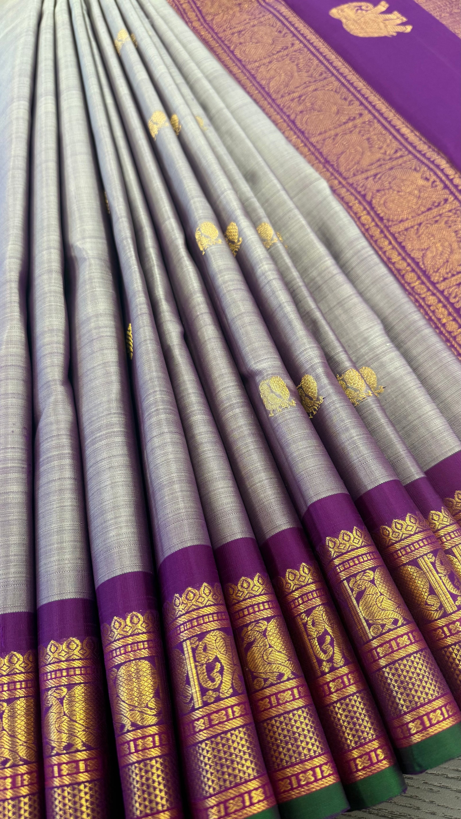 TRADITIONAL DUAL TONE GREYISH PURPLE WITH CONTRAST VADAMALI PURPLE BORDER GOLD ZARI HANDLOOM KANICHIPURAM SILK SAREE (KSS93)