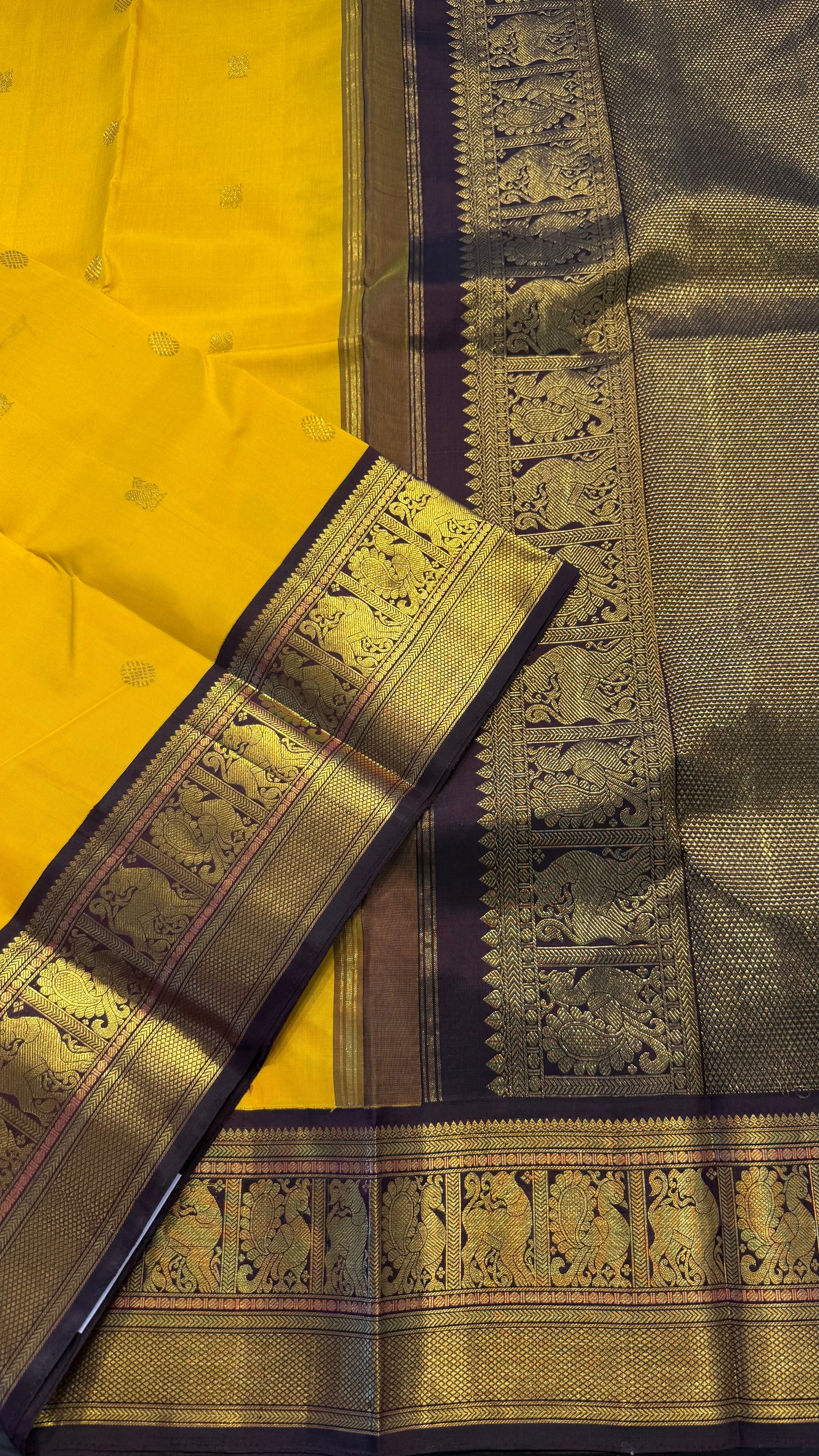 YELLOW WITH CONTRAST PLUM PURPLE GOLD ZARI HANDLOOM KANCHIPURAM SILK SAREE (KSS455)